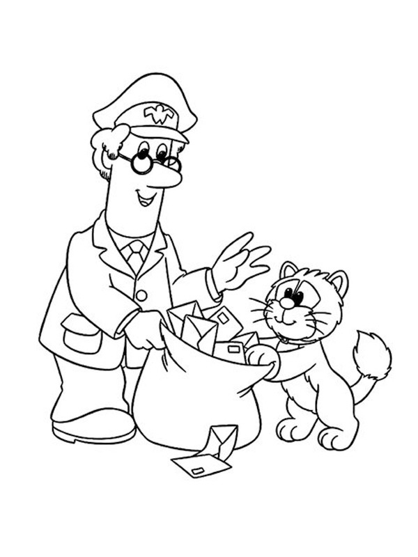 Male jetzt die Ausmalseite von Postbote Pat mit sein Katze aus. Oder male eine der anderen lustigen 6 Postbote Pat Ausmalseiten auf besteausmalbilder.de